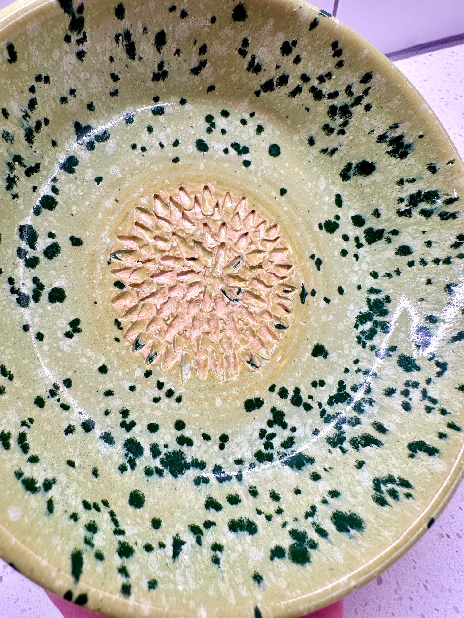 Handmade ceramic dish with a textured center for grating garlic, ginger or spices.